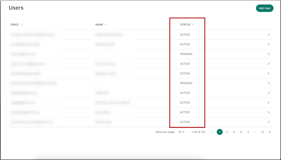 When a user’s account is created, the user receives an invitation to create an account via email. From the Users list, you can track user statuses, resend pending invitations, or remove a user’s access, if needed.